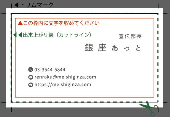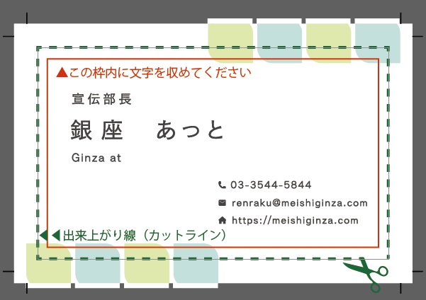 緑の点線 91㍉×55㍉(出来上がり線=カットライン)/赤の線 87㍉×51㍉(文字を収める枠)