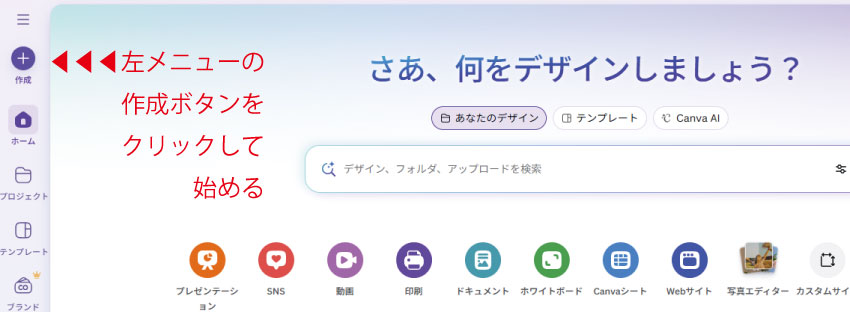 左メニューの『作成』をクリックしてデザイン作成を始める