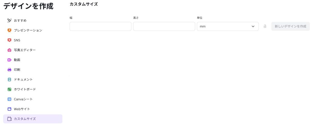 左メニューの『カスタムサイズ』をクリック→単位をmmにしてから幅と高さを入力する